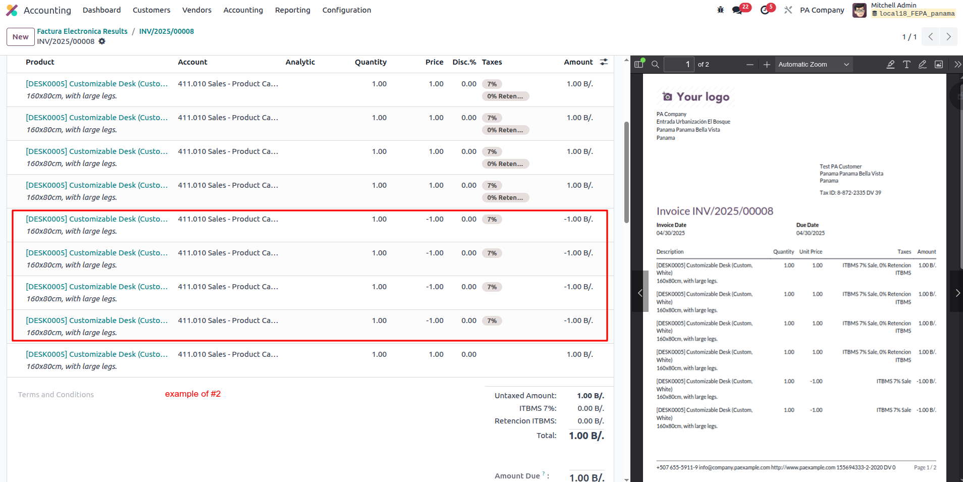 En Odoo, todas las líneas tienen un total negativo; sin embargo, FactoryHKA acepta un máximo de 5 líneas. Si se superan las 5, fusionamos la descripción y sumamos los montos.