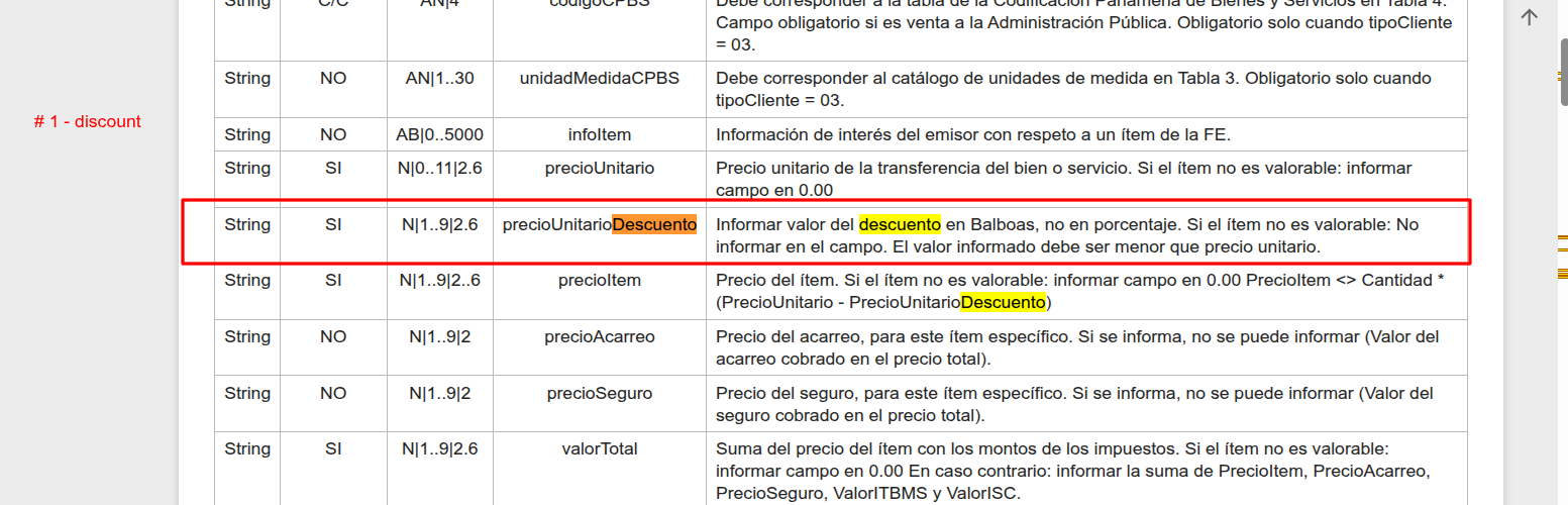 En FactoryHKA, esto se asigna al campo "Descuento" por línea/artículo; pero en lugar de porcentaje, la documentación de FactoryHKA reporta el valor absoluto (monto), no el porcentaje.