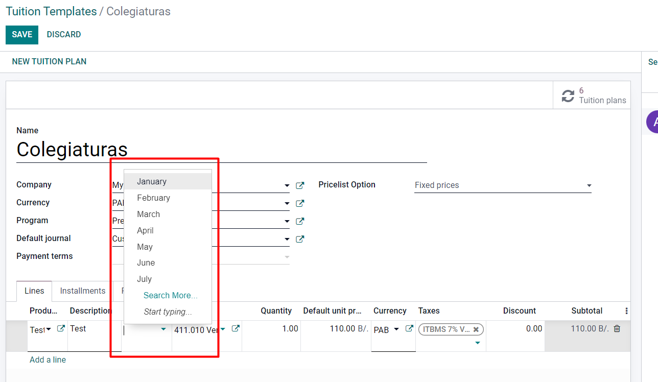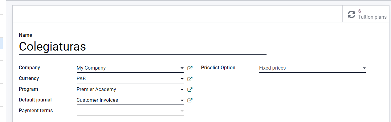 Pricelist Options: Las opciones de las listas de precios. En este caso se puede optar por aplicar becas o descuentos automáticos de diferentes maneras.