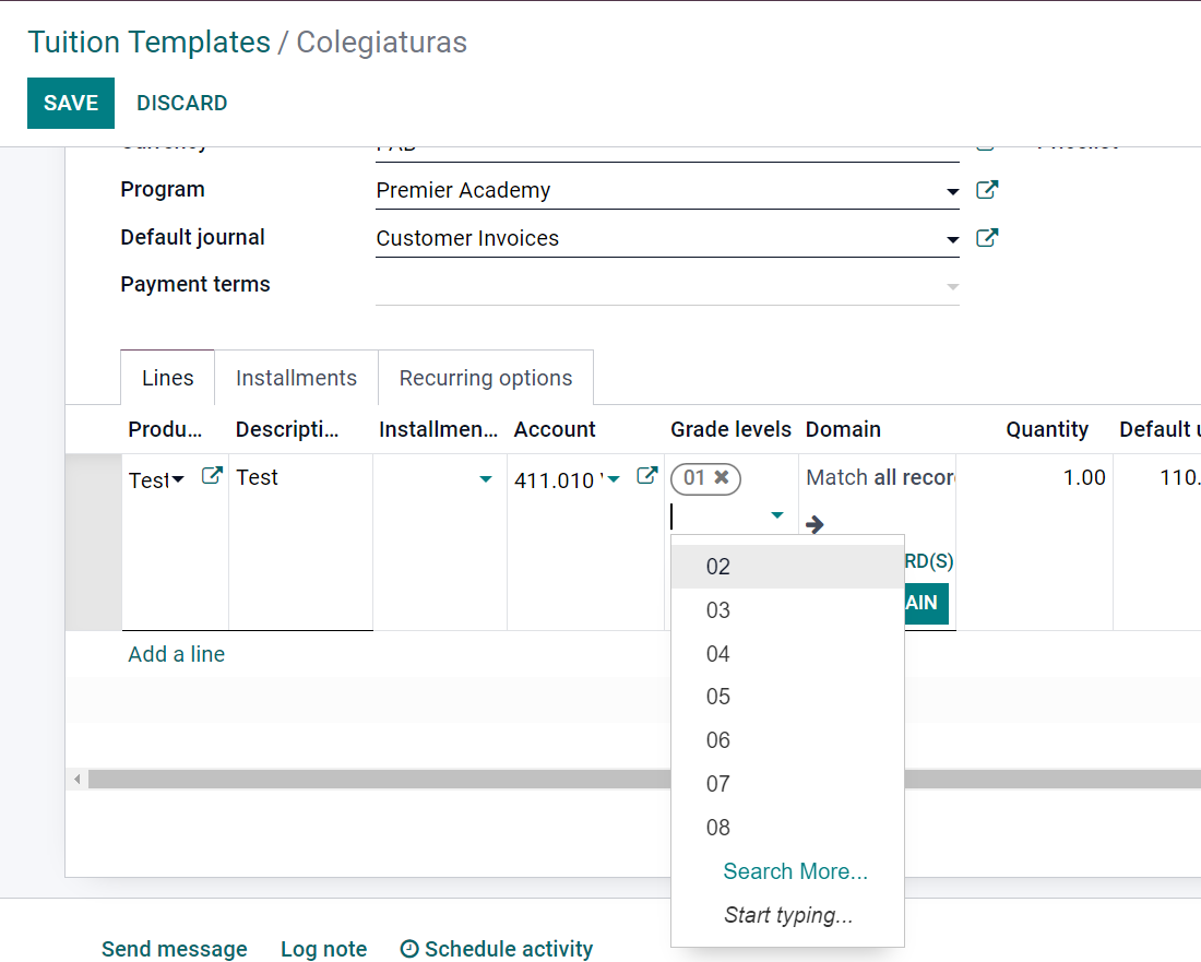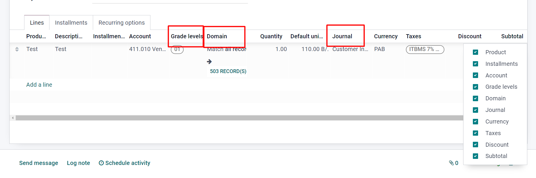Journal: Si se quiere que la factura de una línea se genere en otro diario distingo al establecido en la plantilla, se puede establecer aquí.