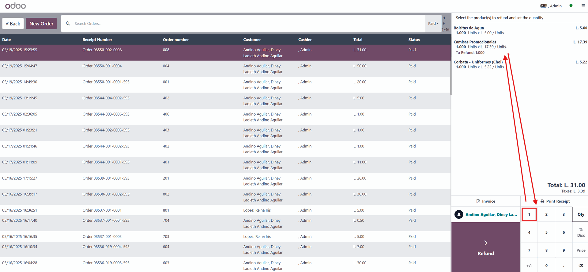 Selecciono ambos productos y marco un 1 porque es la cantidad que hay de cada producto y pulso Refund.