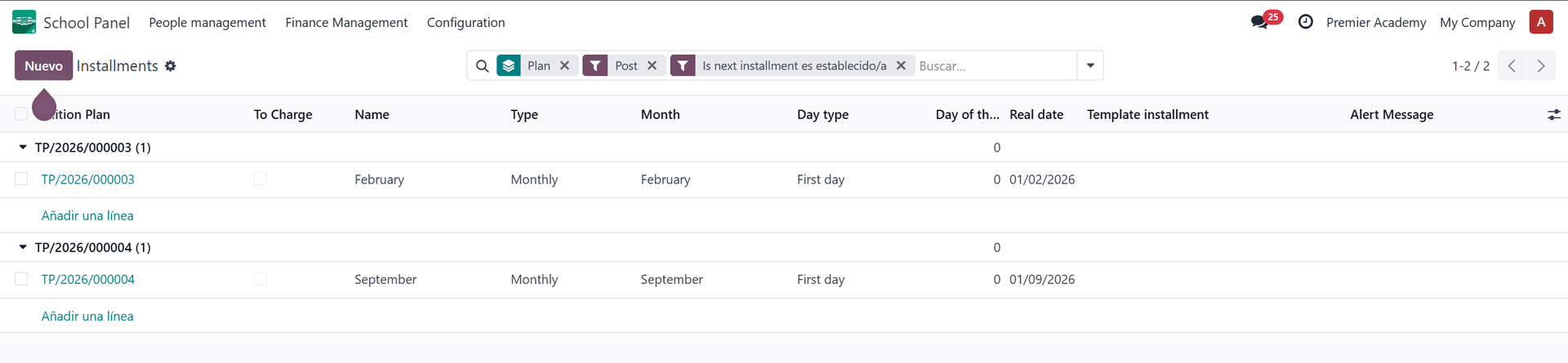 Al estar automatizado el proceso, los plazos son visibles desde School Panel - Finance Management - Installments